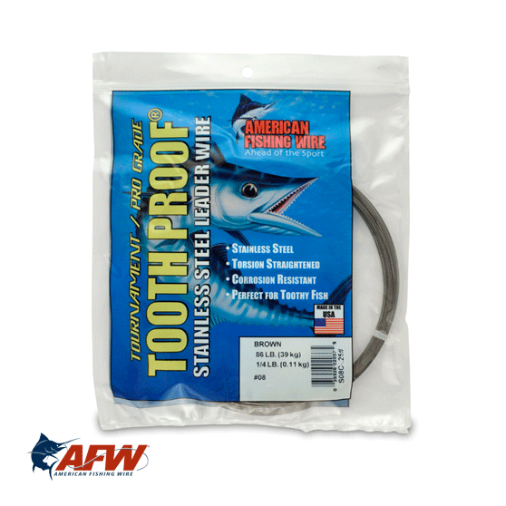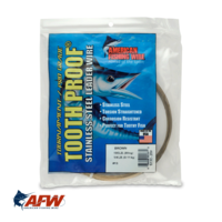AFW Tooth Proof Single Strand leader wire lives up to its name and provides maximum protection against the ferocious jaws of Barracuda, Spanish Mackerel, Wahoo and other toothy fish. Made from a specially controlled Type 304 stainless steel alloy to be hard, but not brittle, and to deliver the perfect combination of flexibility and strength. Tooth Proof possesses incomparable abrasion resistance and tames the toughest toothy fish. AFW’s unique pre-straightening process eliminates cast, providing a straighter leader wire with improved kink resistance. Special Camouflaged Brown finish vanishes in deep water. Tournament tested tough, this proven leader wire continues to put anglers on the winner board! Made in USA!
